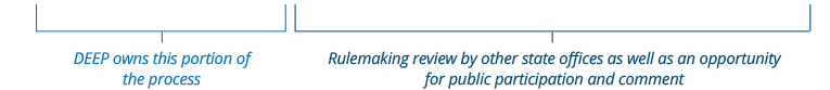 DEEP is committed to making the environmental rulemaking process as transparent and participatory as possible. We ensure the public is properly notified of regulatory proposals and has an opportunity to comment on those proposals. This multi-step process goes through various governmental offices for their review and approval. All approved regulations are filed with the Office of the Secretary of the State (SOTS) and can be reviewed on the SOTS eRegulations System.