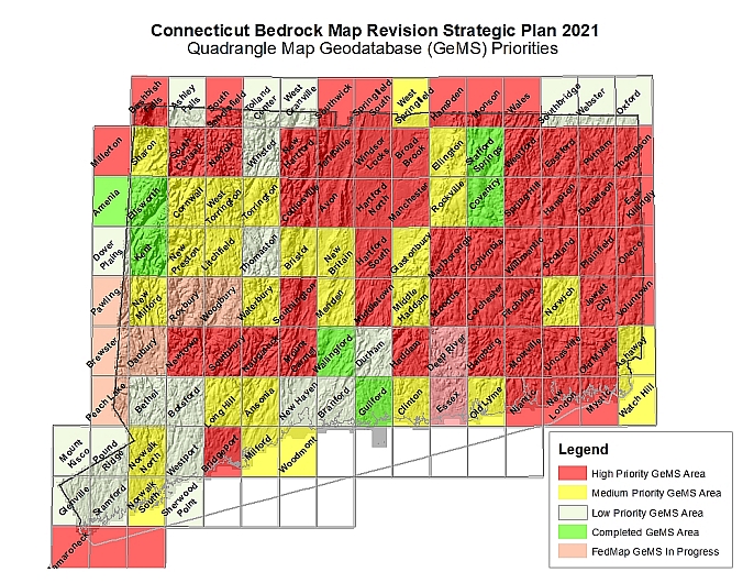 Each 7.5 minute quadrangle in Connecticut has been given a priority rating for both bedrock mapping and digital geodatabase development (GeMS format). Ratings are designated as high, medium, and low priority. Generally, geodatabase development priority areas were identified as the inverse of mapping priorities. Accordingly, high priority work can progress in GIS and field investigations simultaneously.