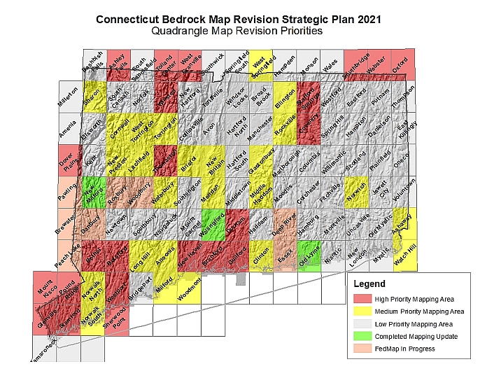 Additional details, scientific contributors, and considerations in the prioritization process are documented in the Connecticut Bedrock Map Revision Strategic Plan. The plan will be updated as work progresses, reviewed annually by the State Geologic Mapping Advisory Committee, and may be altered under advisement by the Committee should societal issues dictate a shift in geologic investigations and mapping efforts.