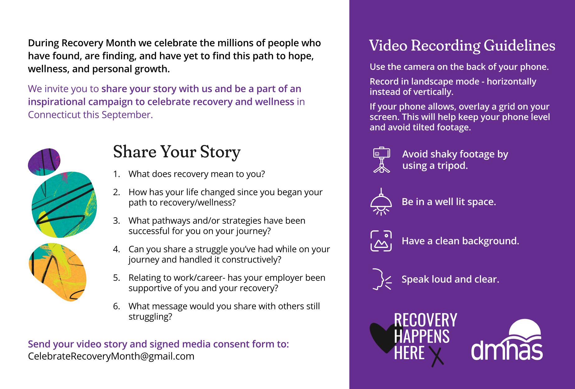 Film a 1-2 minute video describing your journey to recovery and how your life has changed and email it to us at CelebrateRecoveryMonth@gmail.com.