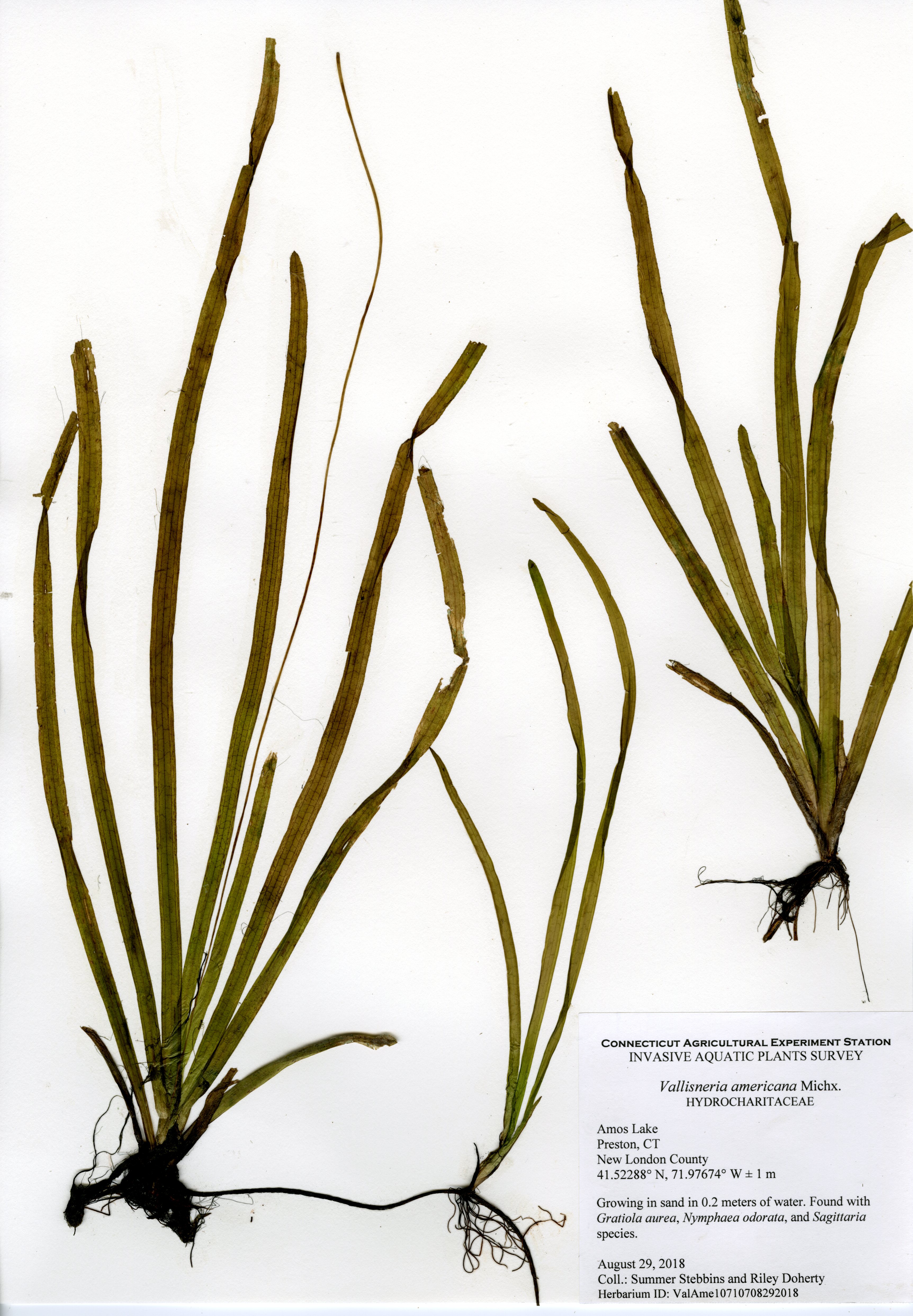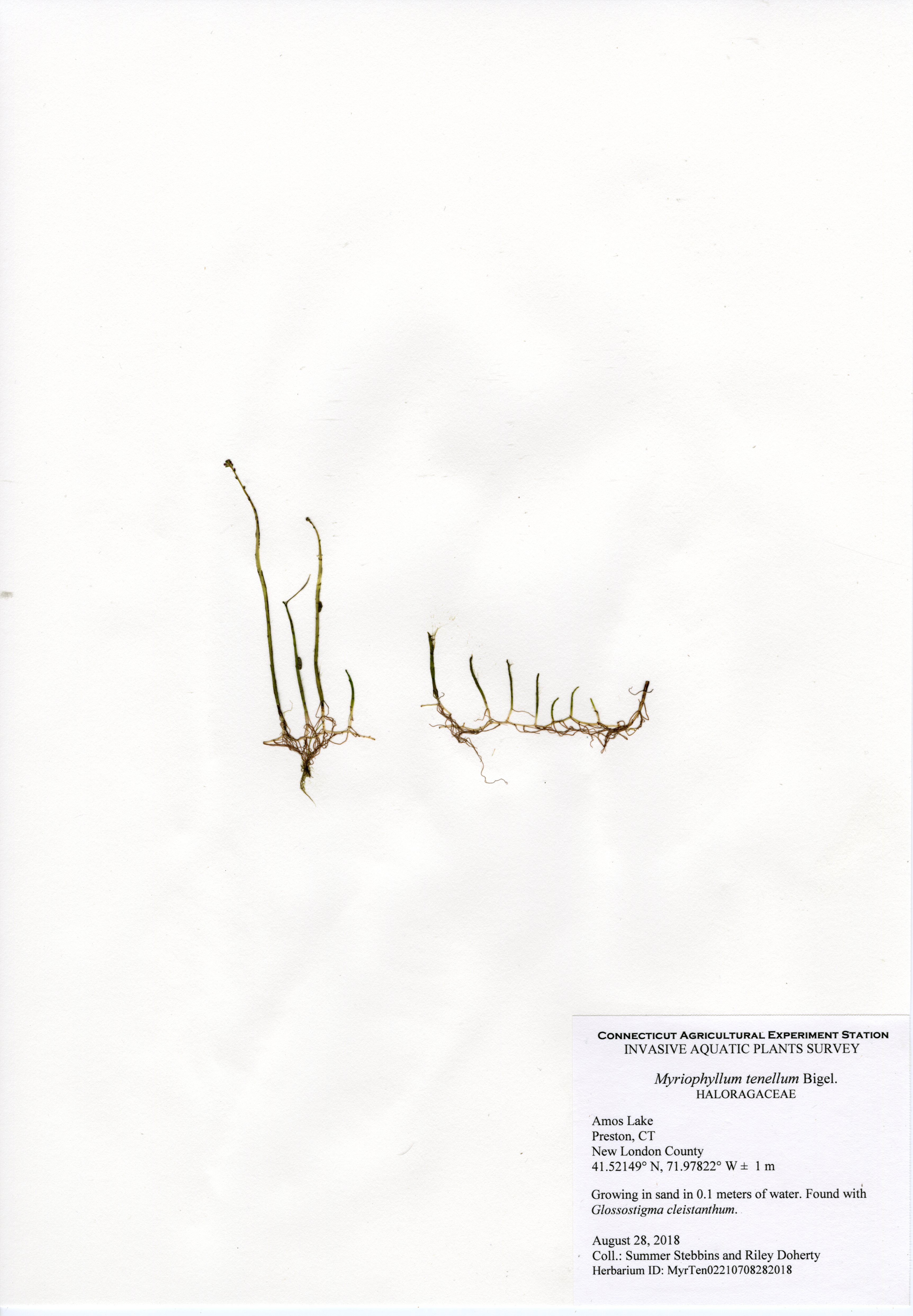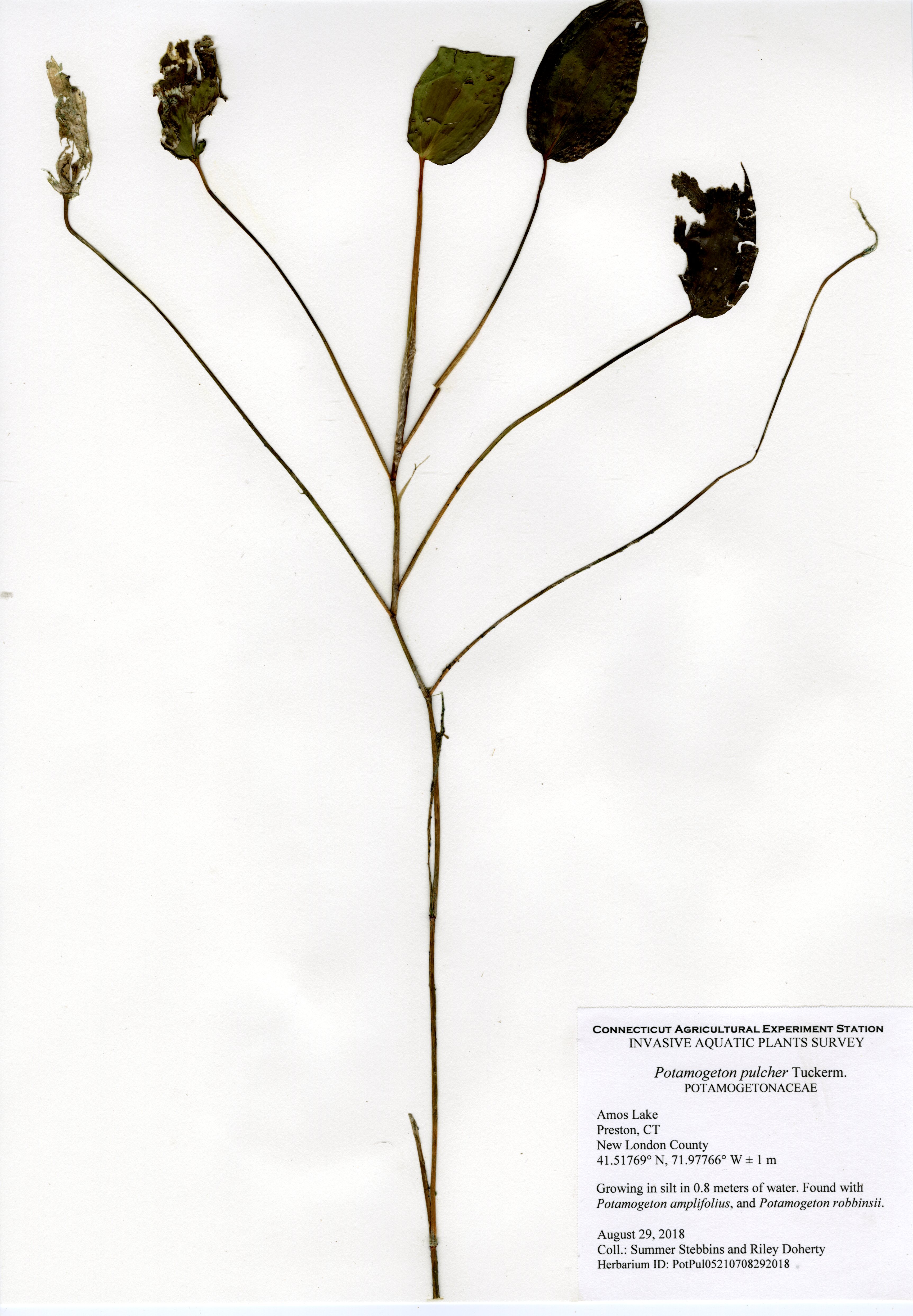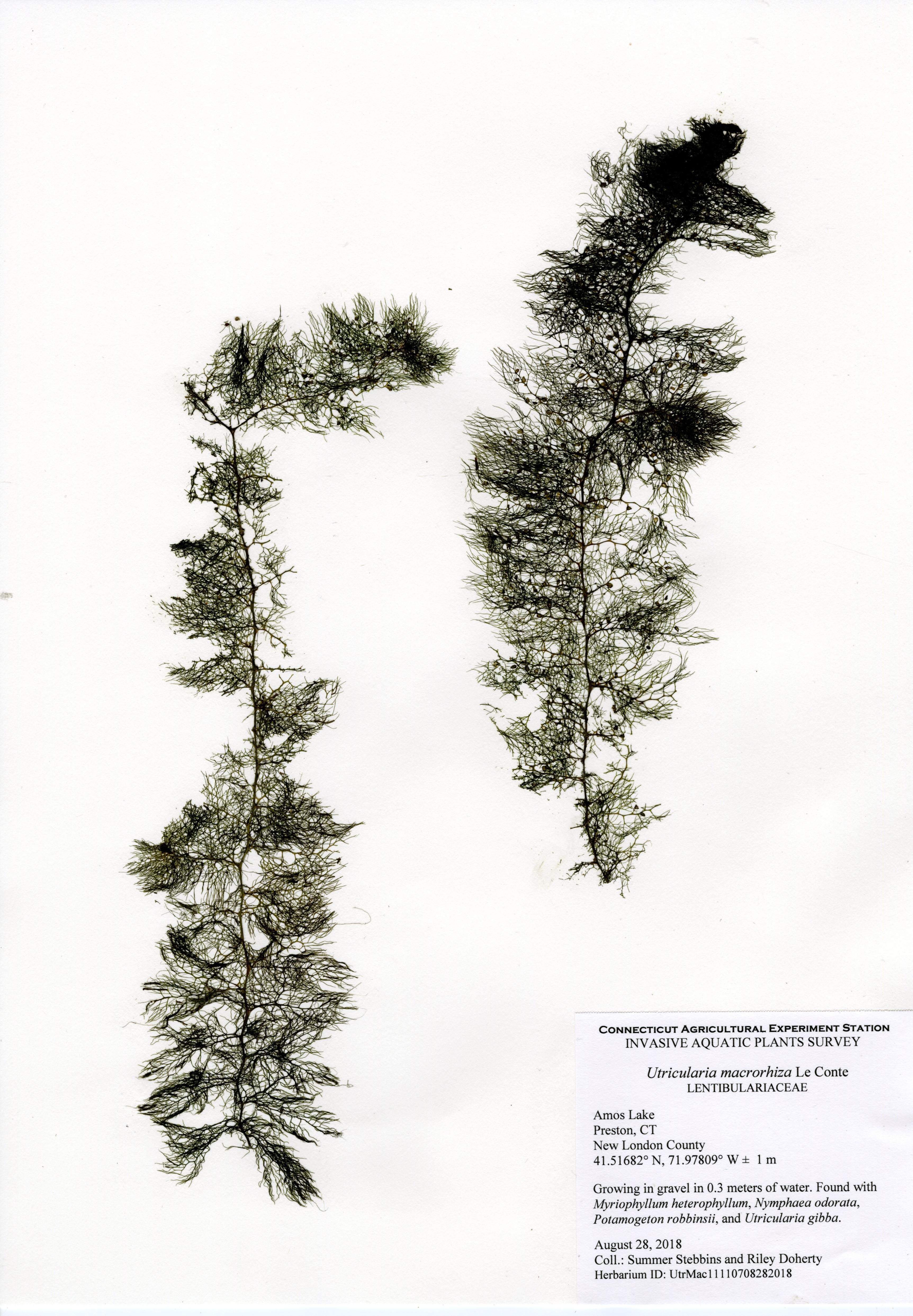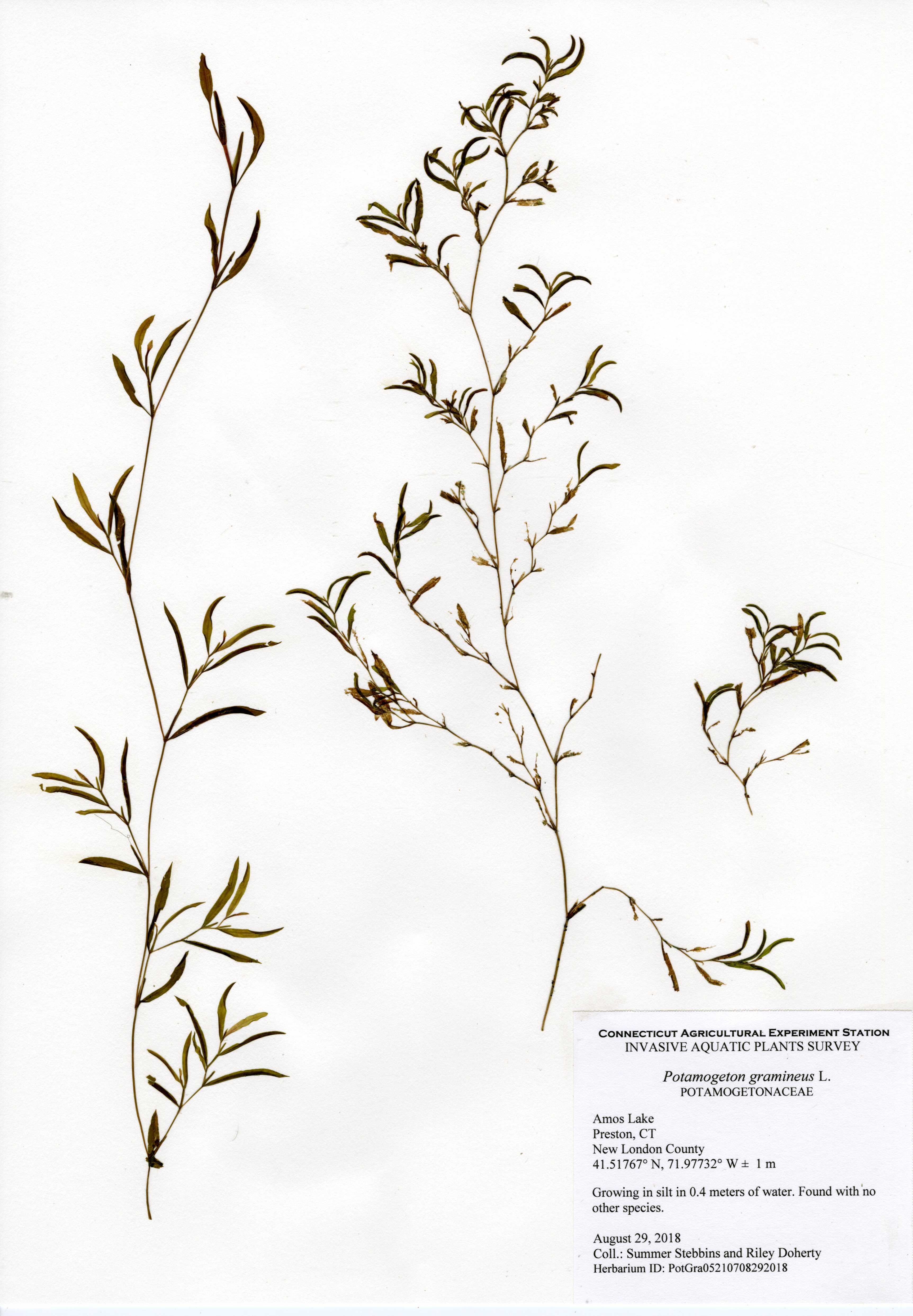 The 2018 vegetative survey of Amos Lake was the third survey performed by CAES IAPP of the waterbody; it was previously surveyed in 2006 and 2013. Similar to previous surveys, variable-leaf watermilfoil (Myriophyllum heterophyllum) was the only invasive found in the lake. It has spread in abundance from a few locations on the western perimeter of the lake to more of the western perimeter as well as a cove on the eastern side. Mudmat (Glossostigma cleistanthum) is also a non-native plant found in the lake, but it is not considered a state-listed invasive species and is rarely a nuisance. Common reed (Phragmites australis), an invasive wetland plant, was found along the northern shoreline of the lake. As found in 2013, Robbins’ pondweed (Potamogeton robbinsii) was the most common plant. It covers almost the entire perimeter of the lake. Overall presence of vegetation increased in 2018 from previous years with dense populations of plants in the coves along the east and west shorelines of the lake. Species richness, however, decreased from 29 in 2013 to 22 species.