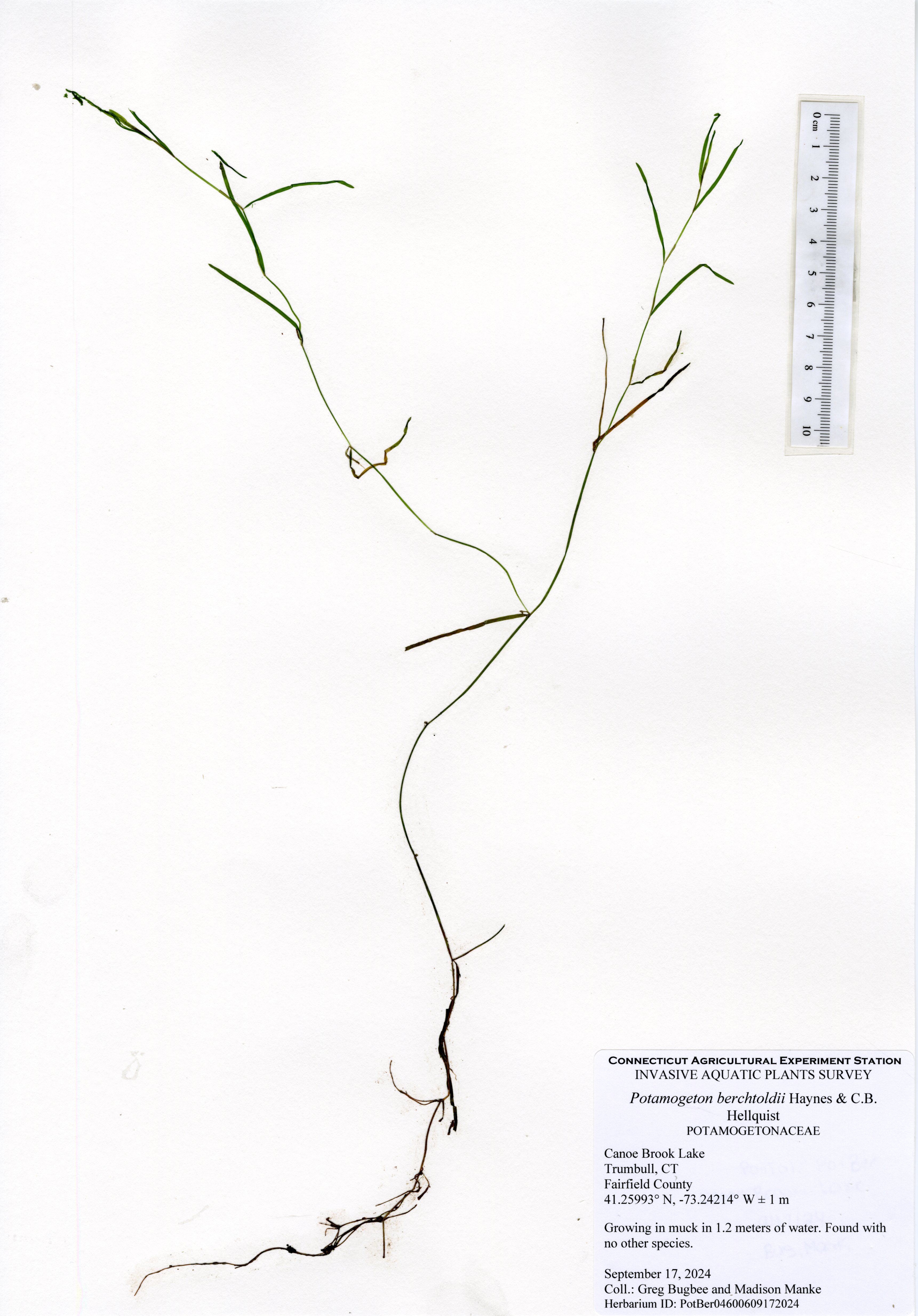 Clasping-leaf pondweed (Potamogeton perfoliatus) was the most common species in the lake and was found throughout the littoral zone. Eelgrass (Vallisneria americana) was the next most common species occuring in intermittent sparse patches. Cattail (Typha species), a native semi-aquatic wetland species, was found in many areas along the shore. All other native species had small populations in different areas of the lake. The northern most cove had eight different native species, including arrowhead (Sagittaria species), Berchtold’s pondweed (Potamogeton berchtoldii), clasping-leaf pondweed, common duckweed (Lemna minor), eelgrass, flat-stemmed pondweed (Potamogeton zosteriformis), variable pondweed (Potamogeton gramineus), and water starwort (Callitriche species). The northern cove appears to be shallowing due to sedimentation from the inlet stream and leave accumulation. Deeper areas of the lake had occasional spots of eelgrass and clasping-leaf pondweed as well as charaphyte, a plant-like freshwater algae. Water transparency was 1.8 meters (6 ft) which is below average for Connecticut lakes and represents a decline from earlier surveys.