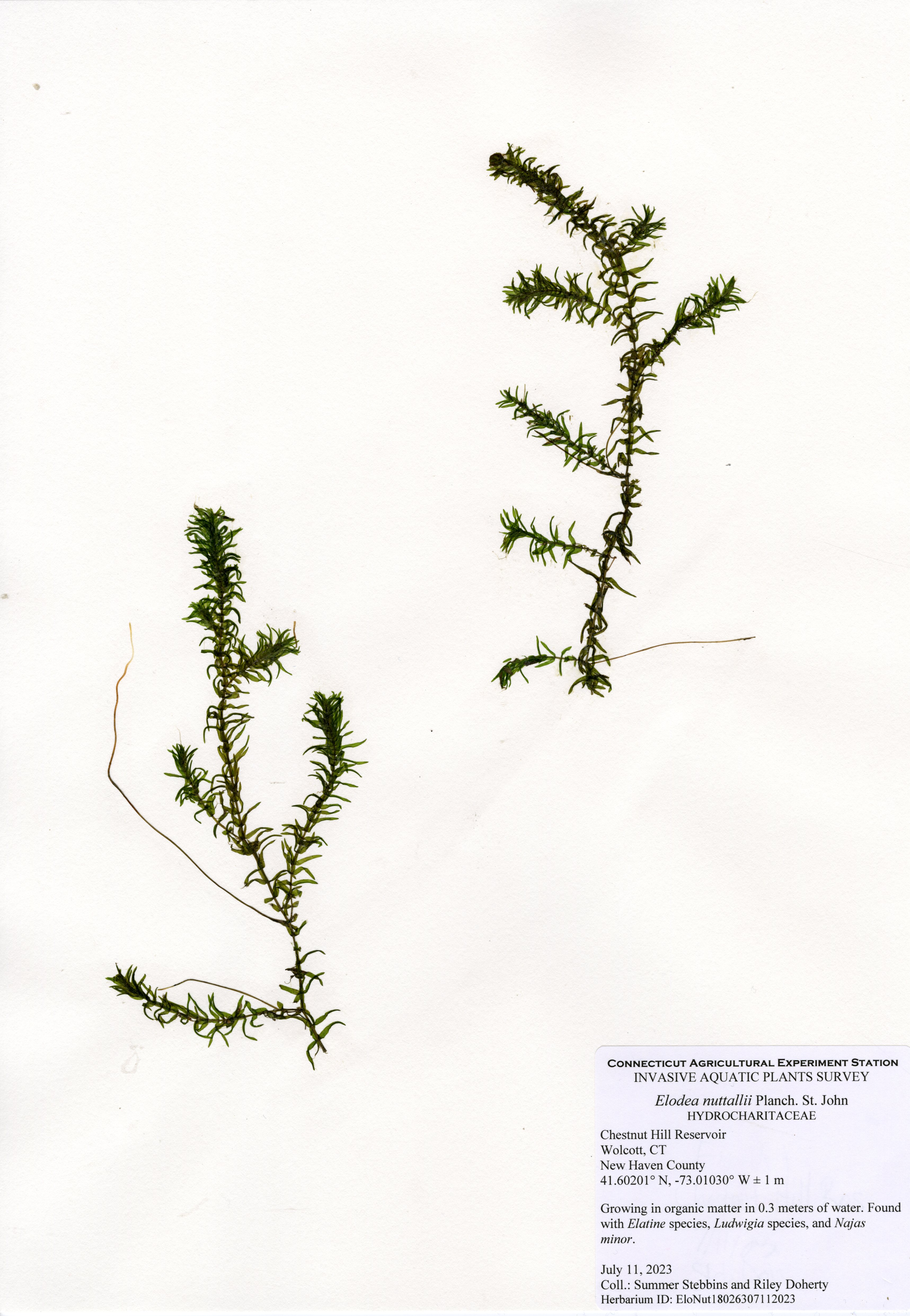 CAES OAIS performed the first aquatic plant survey of the reservoir in July of 2023. A total of 17 plant species were mapped. Of these, three were invasive: minor naiad (Najas minor), phragmites (Phragmites australis), and purple loosestrife (Lythrum salicaria). Minor naiad is an annual, low-growing, invasive aquatic plant that is often found in the shallows. The largest populations of minor naiad were near transects 1, 3, and 5. Native slender naiad (Najas flexilis) can be commonly confused with minor naiad, and they were often found growing together in the reservoir. Minor naiad has highly curled, toothed, brittle leaves whereas slender naiad is often longer with smoother leaves that have no teeth. Phragmites and purple loosestrife are invasive wetland plants found on the shoreline. Phragmites was found frequently along the northern shoreline of the reservoir with one small patch on the southern shoreline. Purple loosestrife was found in one very small location on the southwestern shoreline along the road.