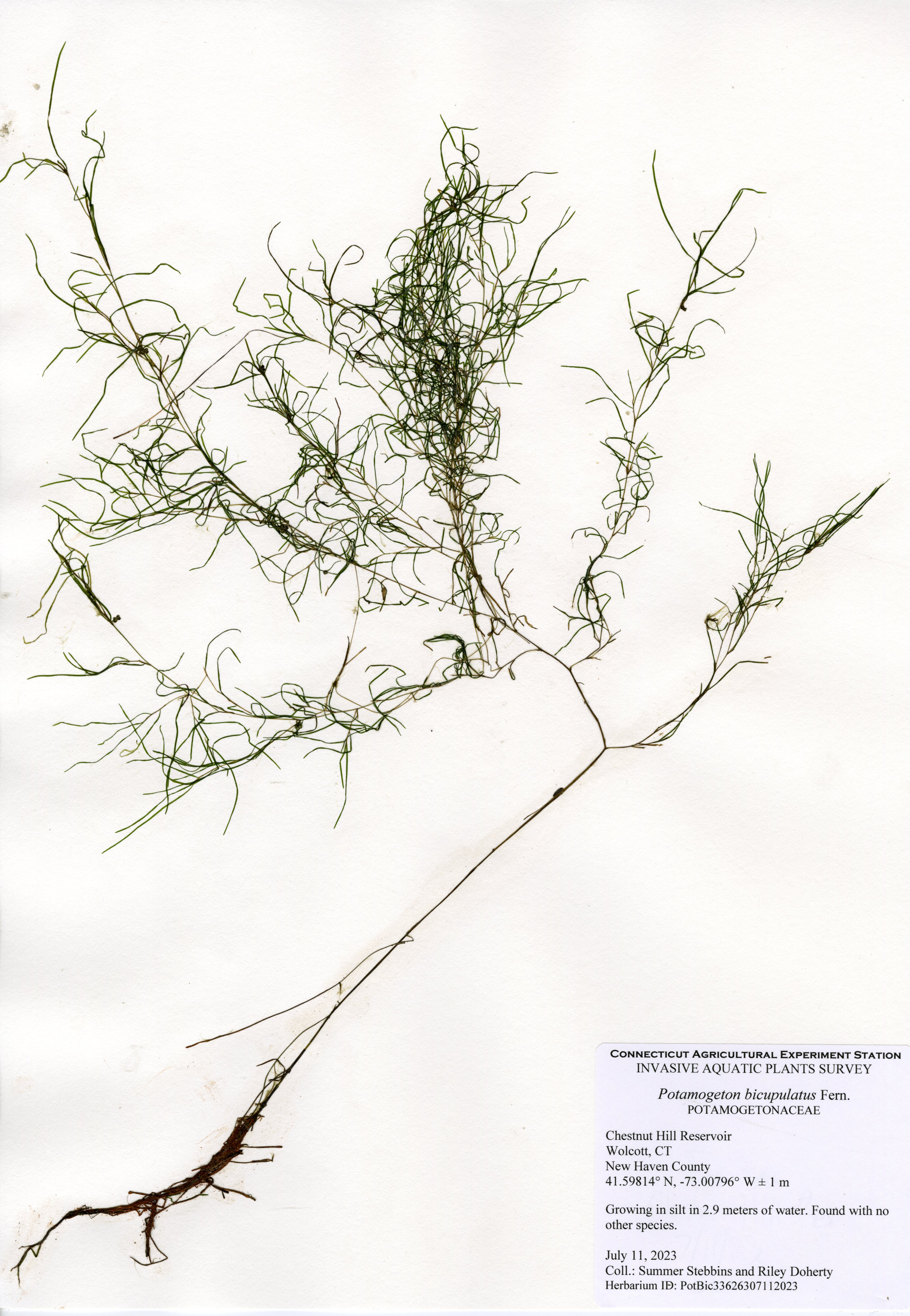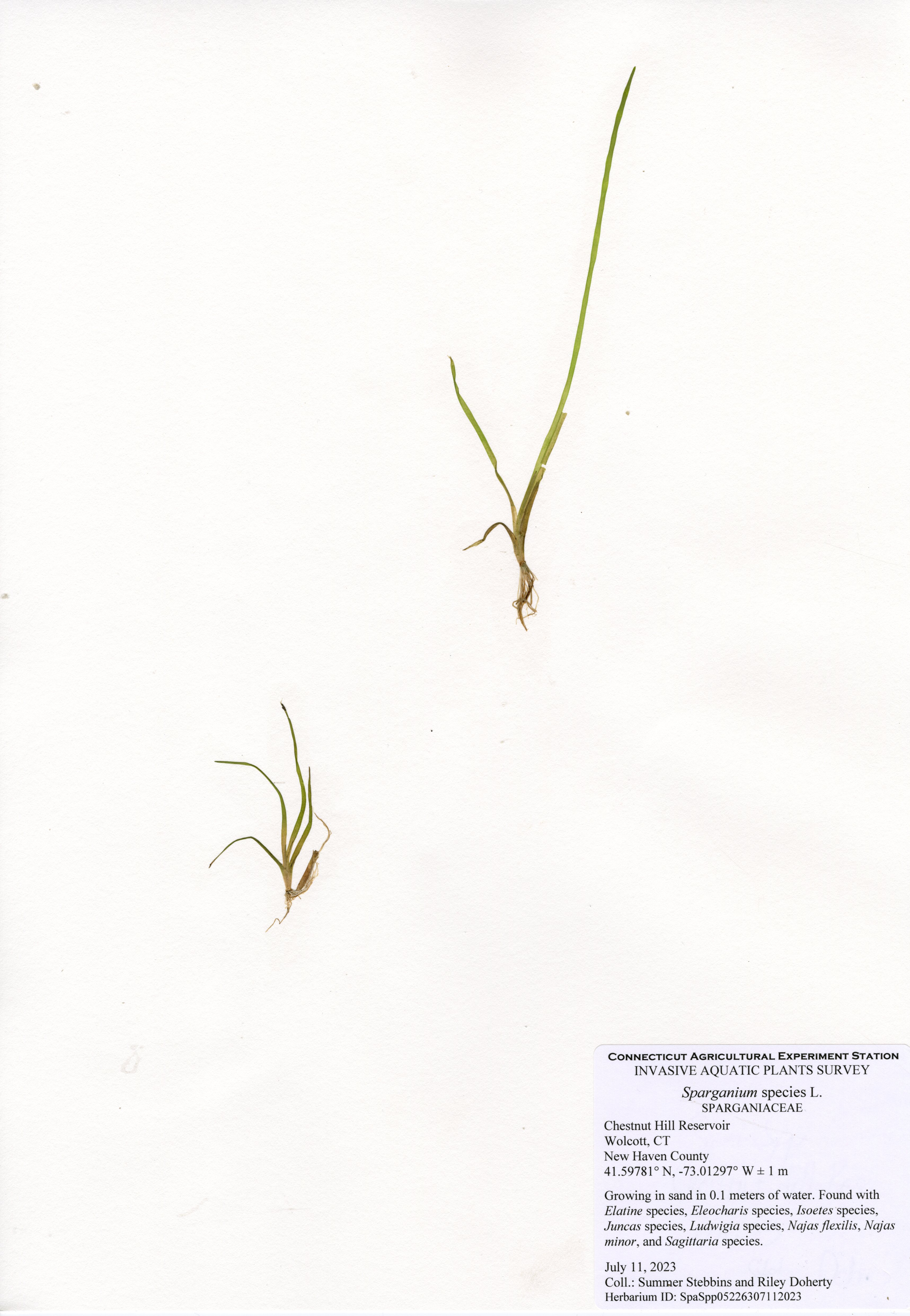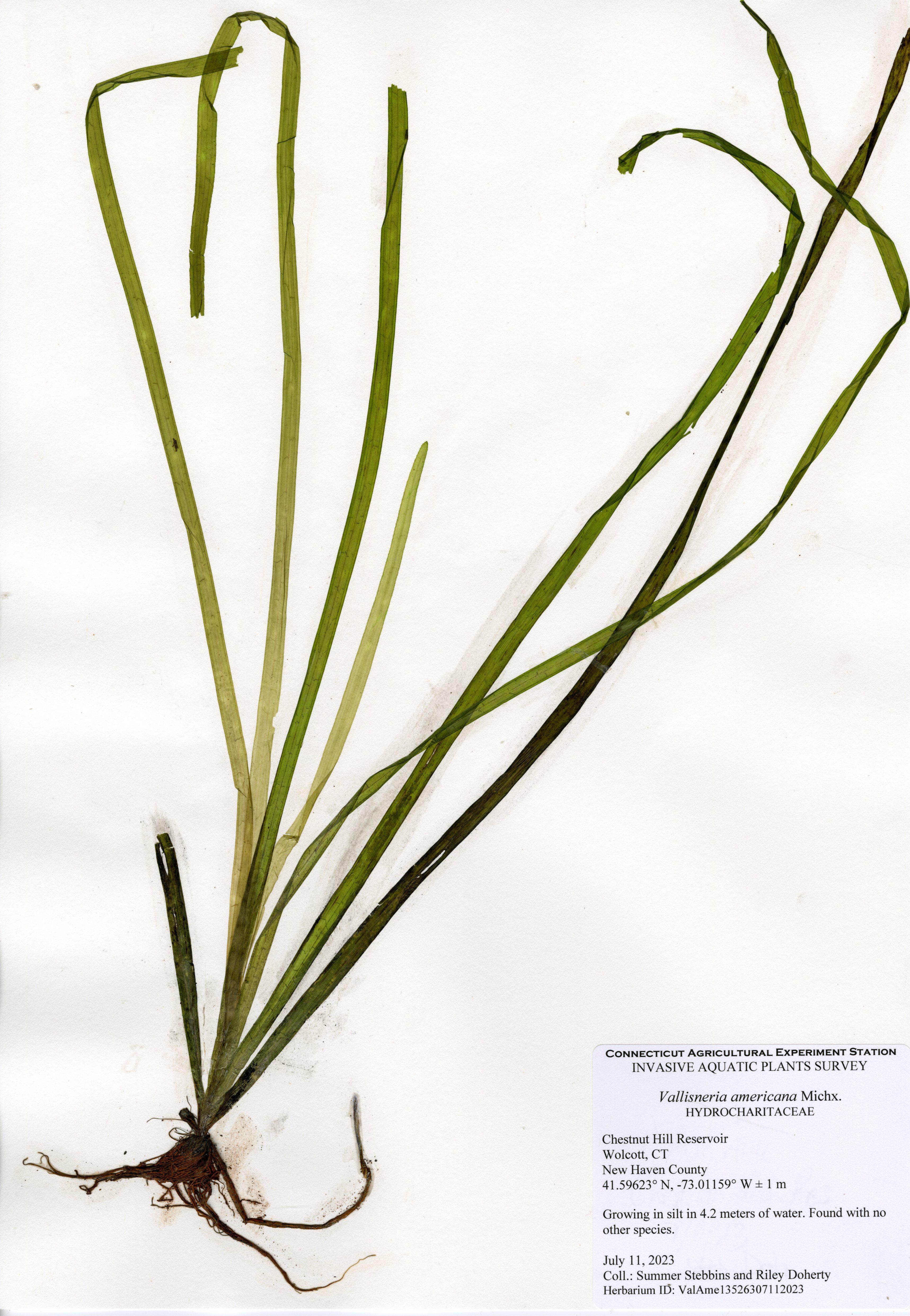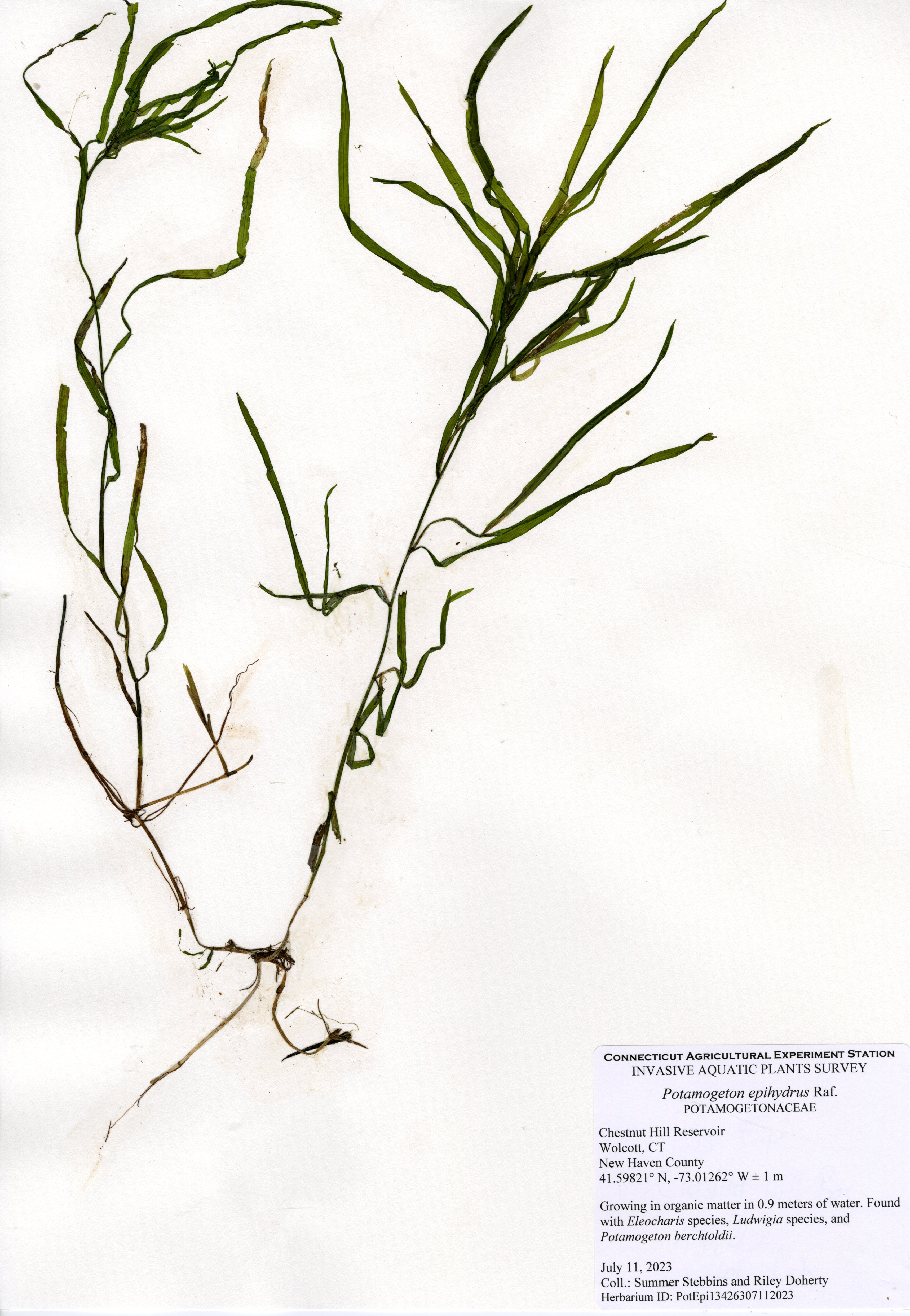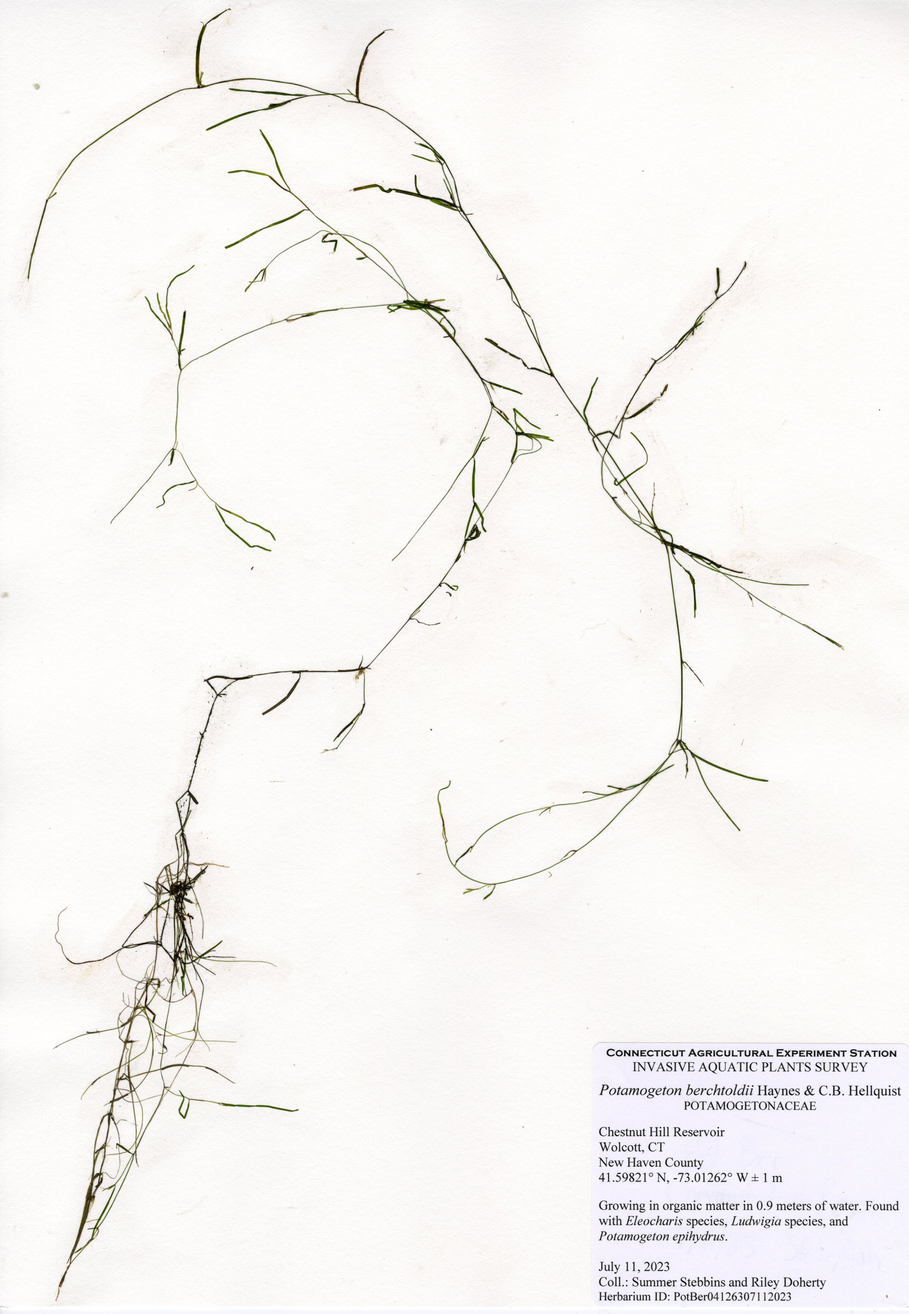 The center of Chestnut Hill Reservoir is too deep to support plants, but plants were present throughout the majority of areas shallow enough to support plants. Fourteen native species were found in the reservoir. Eelgrass (Vallisneria americana) and Berchtold’s pondweed (Potamogeton berchtoldii) were the most common plants and found throughout the shallow areas. Cattails (Typha species) and rush (Juncus species) are native wetland species. Arrowhead (Sagittaria species), bur-reed (Sparganium species), quillwort (Isoetes species), primrose-willow (Ludwigia species), spikerush (Eleocharis species), and waterwort (Elatine species) are low-growing native species found in very shallow waters near the shoreline. Ribbon-leaf pondweed (Potamogeton epihydrus), snailseed pondweed (Potamogeton bicupulatus), and western waterweed (Elodea nuttallii) were found near transects 1 and 5.
