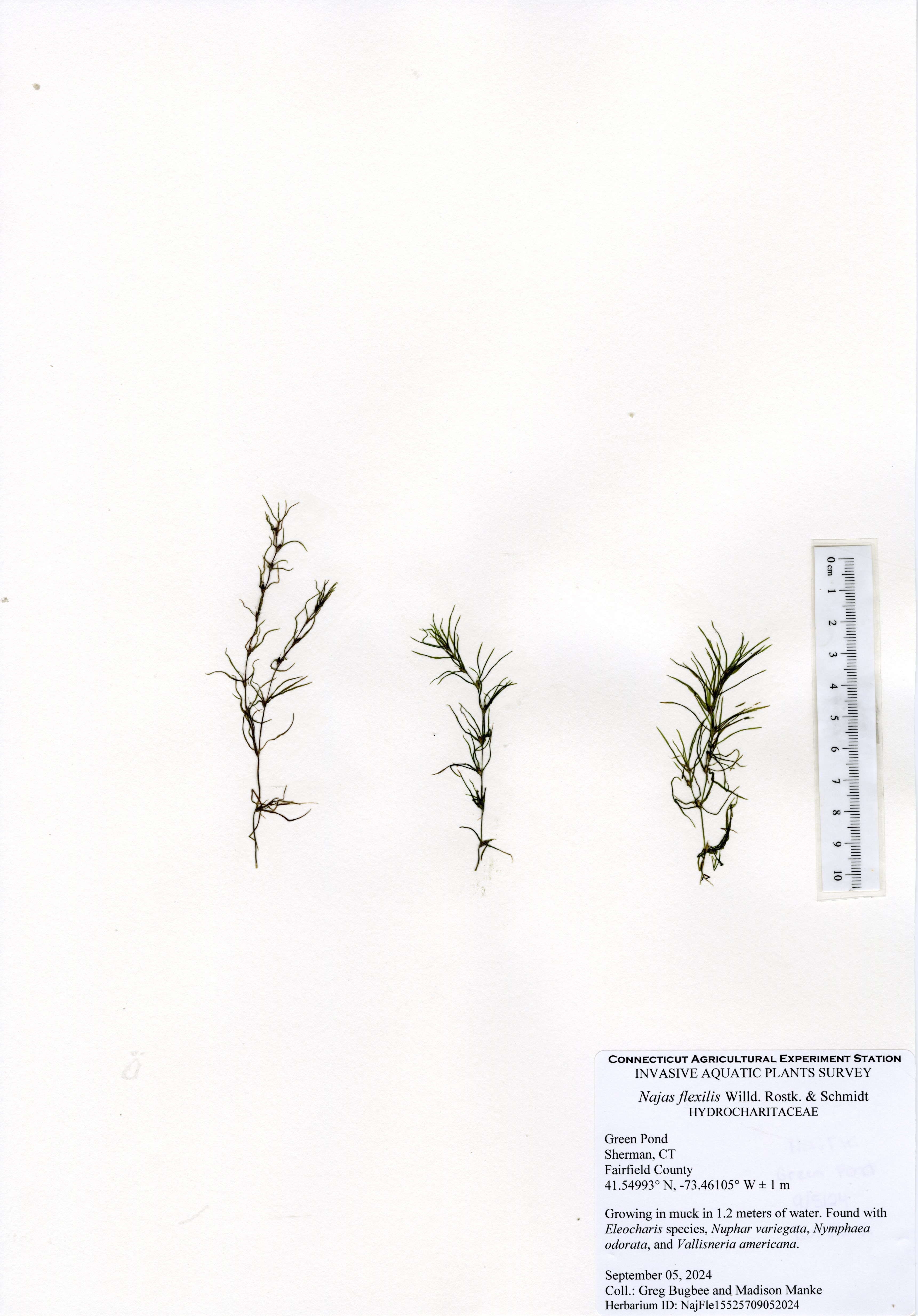 Minor naiad (Najas minor) was the other invasive species found in the lake in 2022. It was found by the beach in the north end and in a few locations along the western side of the pond. Minor naiad is an annual plant that regrows each year from the previous year’s seed. Thus, it is not noticeable until early to mid-summer when it grows in patches in the shallows. It often is most abundant in and around beaches. CAES OAIS is not aware of any control practices performed on this plant in Connecticut apparently because it is not a nuisance. If management in beach areas is desired, it can easily be removed with a rake.  In 2023, the herbicide ProcellaCOR was applied to control Eurasian watermilfoil.