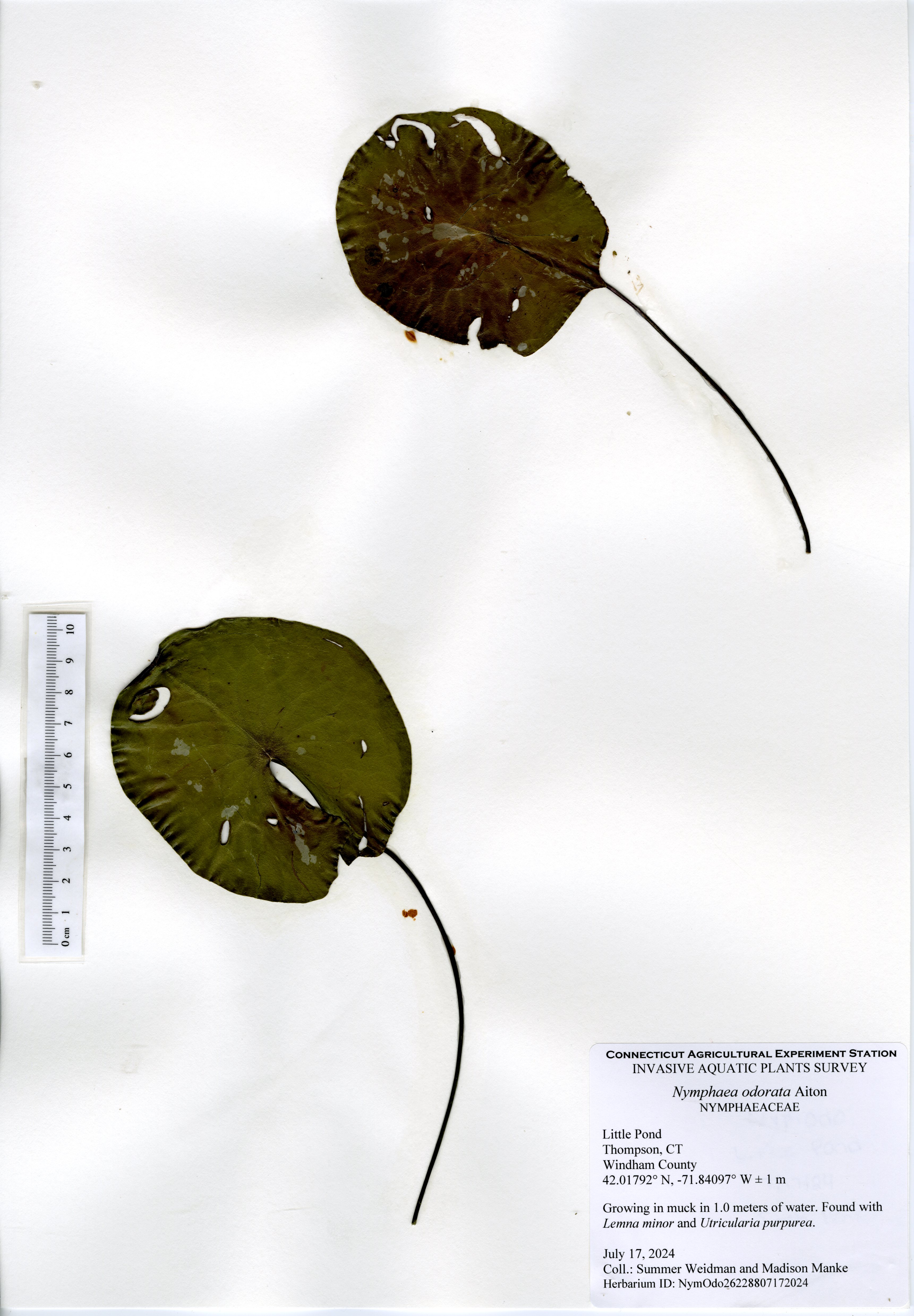 The rest of the aquatic vegetation found in the pond was native. Of particular importance is dollarweed (Hydrocotyle umbellata) also known as water pennywort, a threatened plant, found along the northwestern side of the pond in small patches. White water lily (Nymphaea odorata) was the most abundant species, occurring in small patches along the entire shoreline. Other prevalent species included pickerelweed (Pontederia cordata) and yellow water lily (Nuphar variegata), both of which were widespread throughout the pond. All other native species were present in smaller populations, distributed across various areas of the pond. Overall, Little Pond supports a diverse array of native aquatic plant species, with relatively limited patches of invasive plant populations.