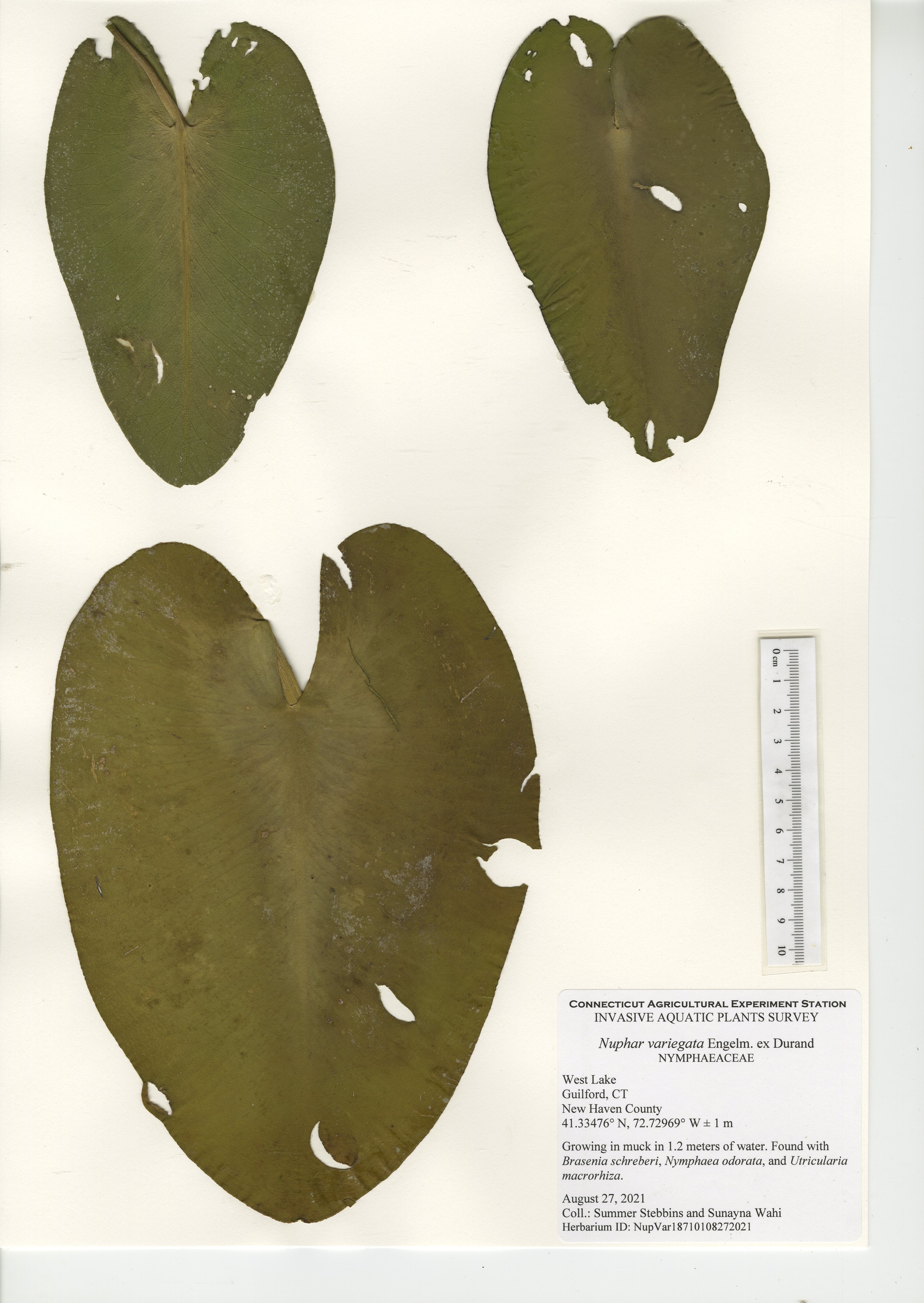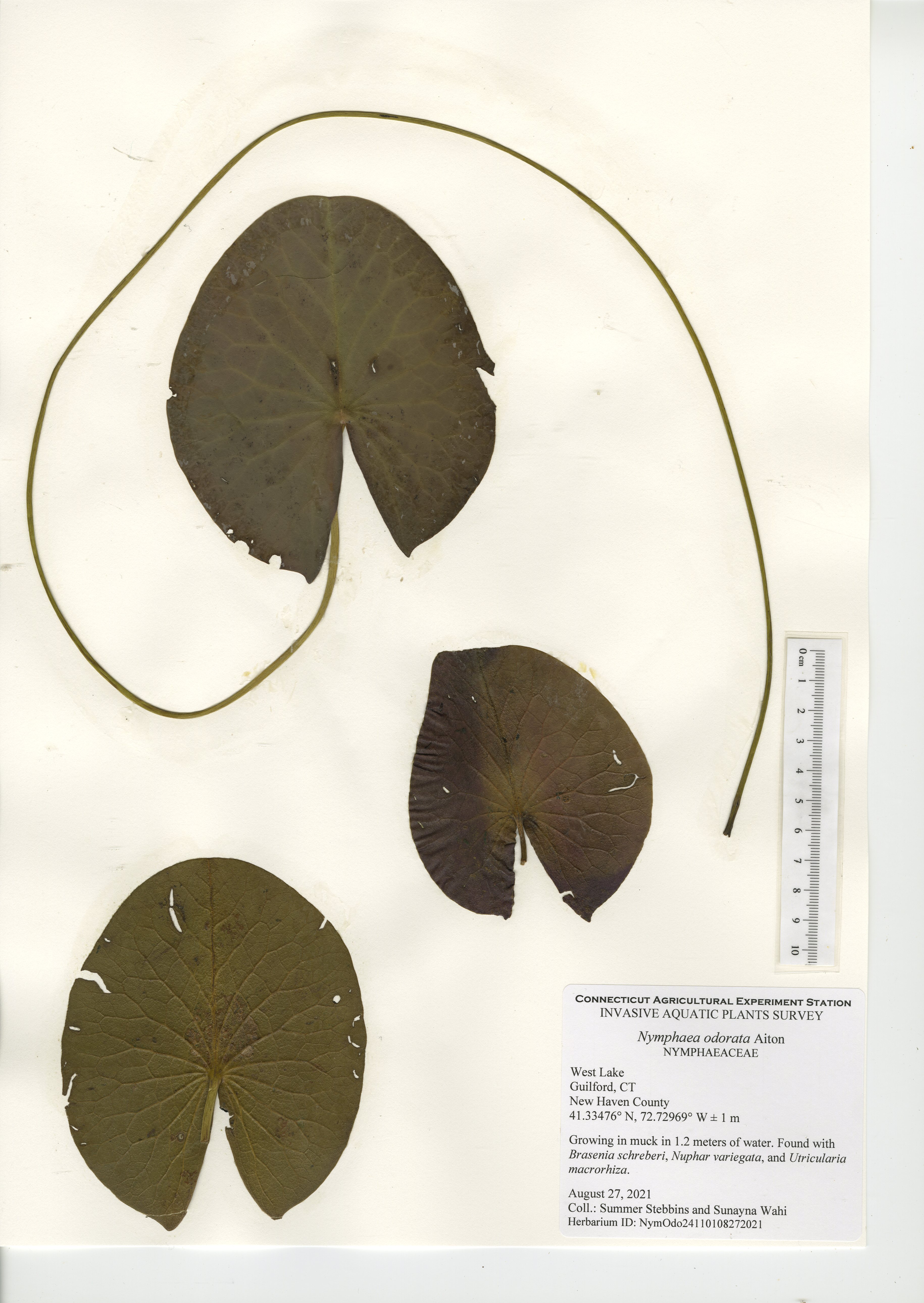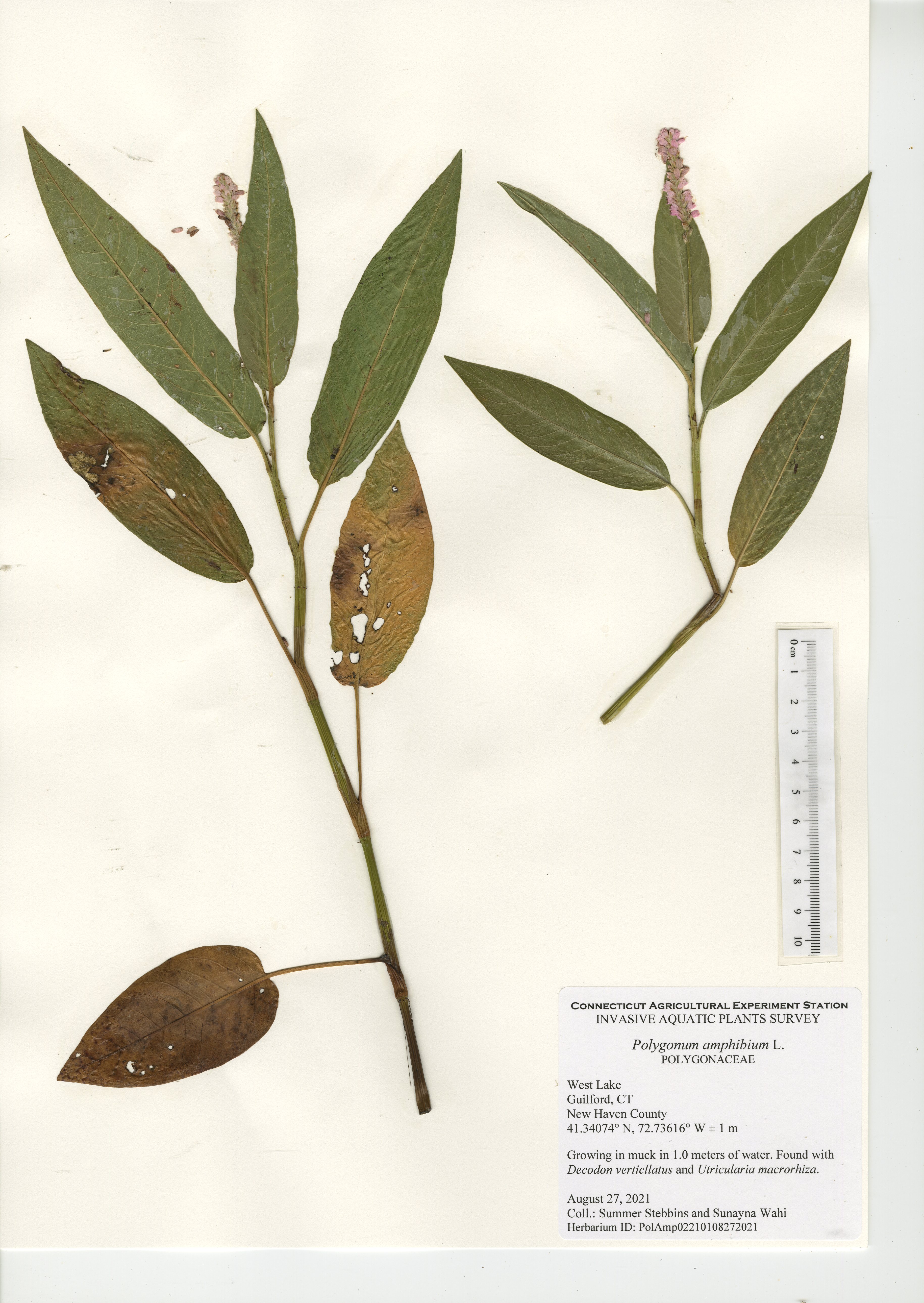 West Lake is a 52-acre lake located in Guilford, CT. The lake was surveyed for the third time in 2021 by CAES IAPP with the previous surveys occurring in 2005 and 2010. Nineteen native species were found in 2021, compared to 27 in 2010 and 18 in 2005. Minor naiad (Najas minor) was the only non-native invasive aquatic plant found during the 2005 and 2010 surveys; however, it was not observed during our 2021 survey. No invasive aquatic plants were therefore observed in 2021. This along with the decline in native species was likely caused by an aquatic herbicide application performed approximately a month prior to our survey. Two invasive non-aquatic wetland plants were found during the 2021 survey: phragmites (Phragmites australis) and purple loosestrife (Lythrum salicaria). Our documentation of non-aquatic plant species is outside the scope of CAES IAPP surveys and is performed at the discretion of the surveyor. Comparing their presence from survey-to-survey is therefore unreliable.