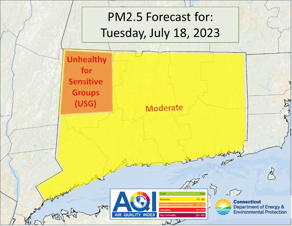 DEEP Forecasts PM2.5 Levels Today will be “Unhealthy for Sensitive Groups” for Northwest Connecticut from Canadian Wildfire Smoke