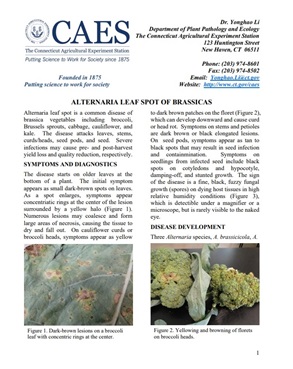 Alternaria leaf spot is a common disease of brassica vegetables including broccoli, Brussels sprouts, cabbage, cauliflower, and kale. The disease attacks leaves, stems, curds/heads, seed pods, and seed. Severe infections may cause pre- and post-harvest yield loss and quality reduction, respectively. Read more details in the linked fact sheet Alternaria Leaf Spot of Brassicas