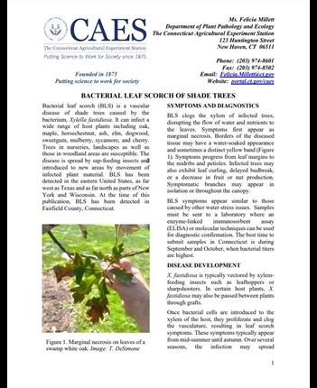 New Fact Sheet Published Online – Bacterial Leaf Scorch of Shade Trees