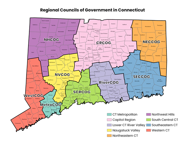 Connecticut’s nine (9) planning regions provide a geographic framework within which municipalities can jointly address common interests and coordinate such interests with state plans and programs. CGS Section 16a-4a authorizes the Secretary of the Office of Policy and Management (OPM) to designate or redesignate the boundaries of logical planning regions.