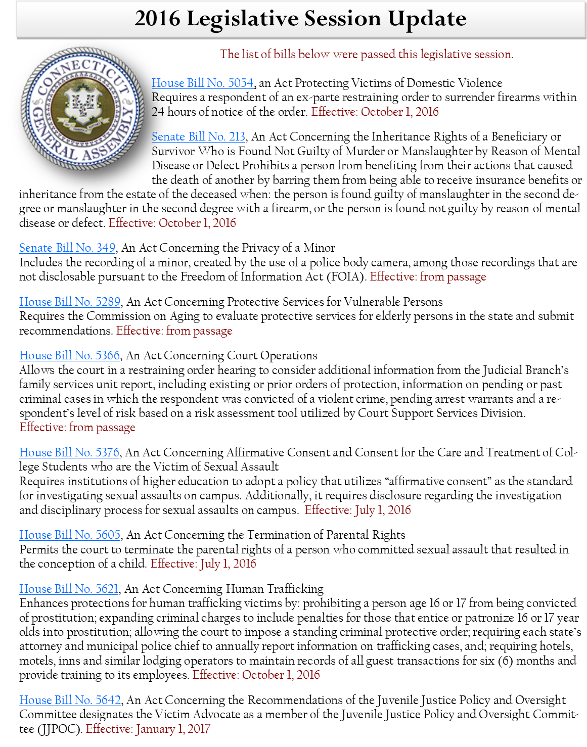 The Office of The Victim Advocate actively monitors and comments on proposed legislation that will directly affect victims of crime. Below are the summaries of each legislative session by year.