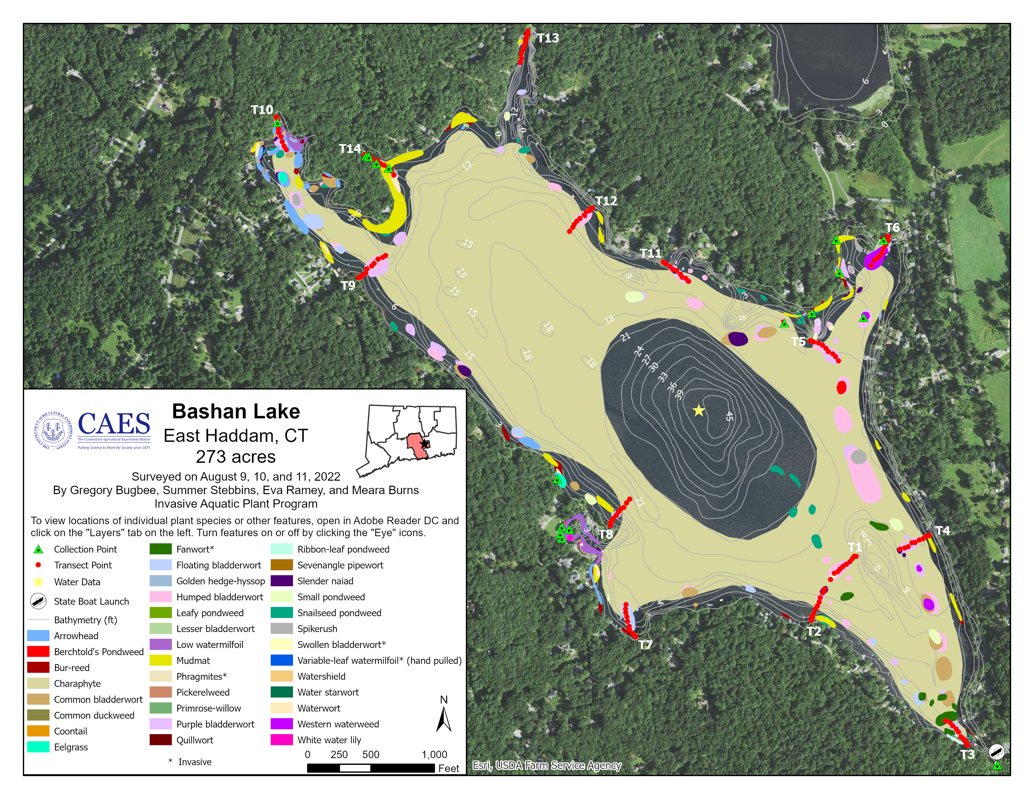 CAES IAPP has monitored and treated invasive plants in Bashan Lake for over 20 years. Previous aquatic plant surveys for all native and invasive plants were performed in 2004, 2014, 2016, and 2020. These surveys documented 13 – 26 plant species with the greatest number occurring in the latter years. Bashan Lake had extensive areas of invasive variable-leaf watermilfoil (Myriophyllum heterophyllum) and a small area of invasive fanwort (Cabomba caroliniana).