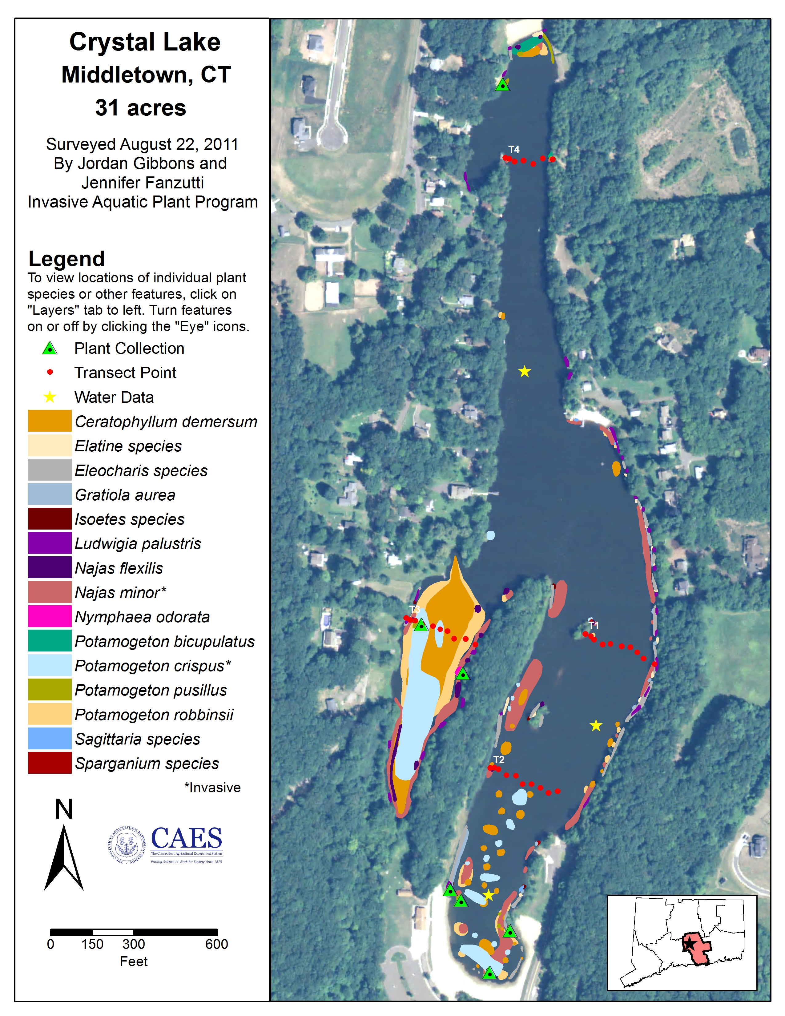 The 2011 vegetative survey is the fourth year the CAES IAPP has done a full vegetative survey on Crystal Lake. The 2011 survey found 15 aquatic species growing in the lake. Two invasive species were present, similar to 2009 and 2010. The invasive species are minor naiad (Najas minor) and curlyleaf pondweed (Potamogeton crispus). Minor naiad was most dominant; however, this is due to the fact that curlyleaf pondweed grows in the spring and dies back in the summer. An early summer preliminary survey found curlyleaf pondweed growing in most of the littoral zone of the lake. The native species coontail (Ceratophyllum demersum) and Robbins' pondweed (Potamogeton robbinsii) continue to be the most dominant native species in the lake. All four of these species were found growing most densely in the southwestern arm of the lake but were also found throughout the lake. Other plants that grew close to shore and in small patches include waterwort (Elatine species), spikerush (Eleocharis species), golden hedge-hyssop (Gratiola aurea), quillwort (Isoetes species), slender naiad (Najas flexilis), arrowhead (Sagittaria species), and bur-reed (Sparganium species). White water lily (Nymphaea odorata) was only found in a small patch in the southwestern arm. Small pondweed (Potamogeton pusillus) and snailseed pondweed (Potamogeton bicupulatus) were found at the northern and southern ends of the lake in small to medium patches..