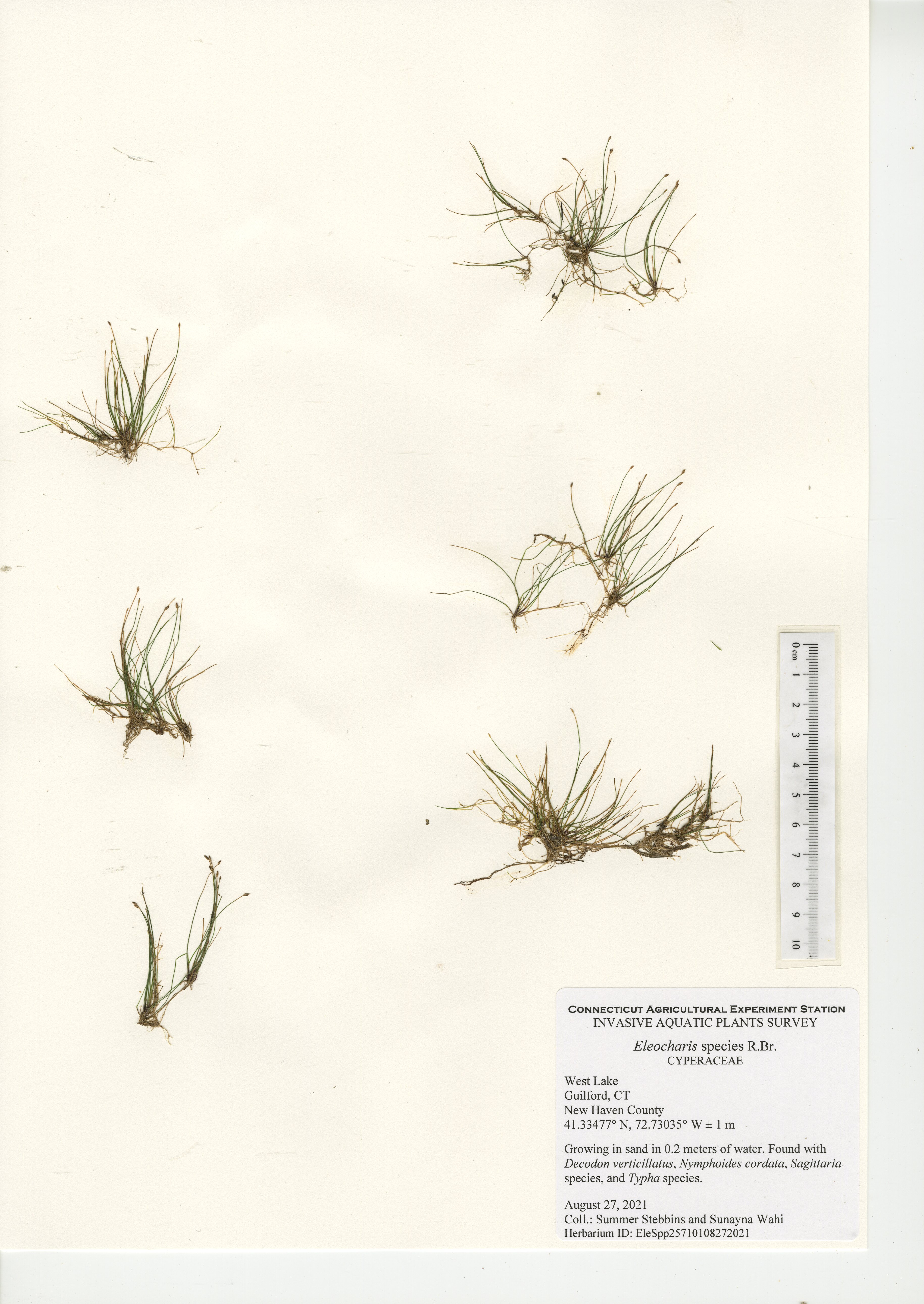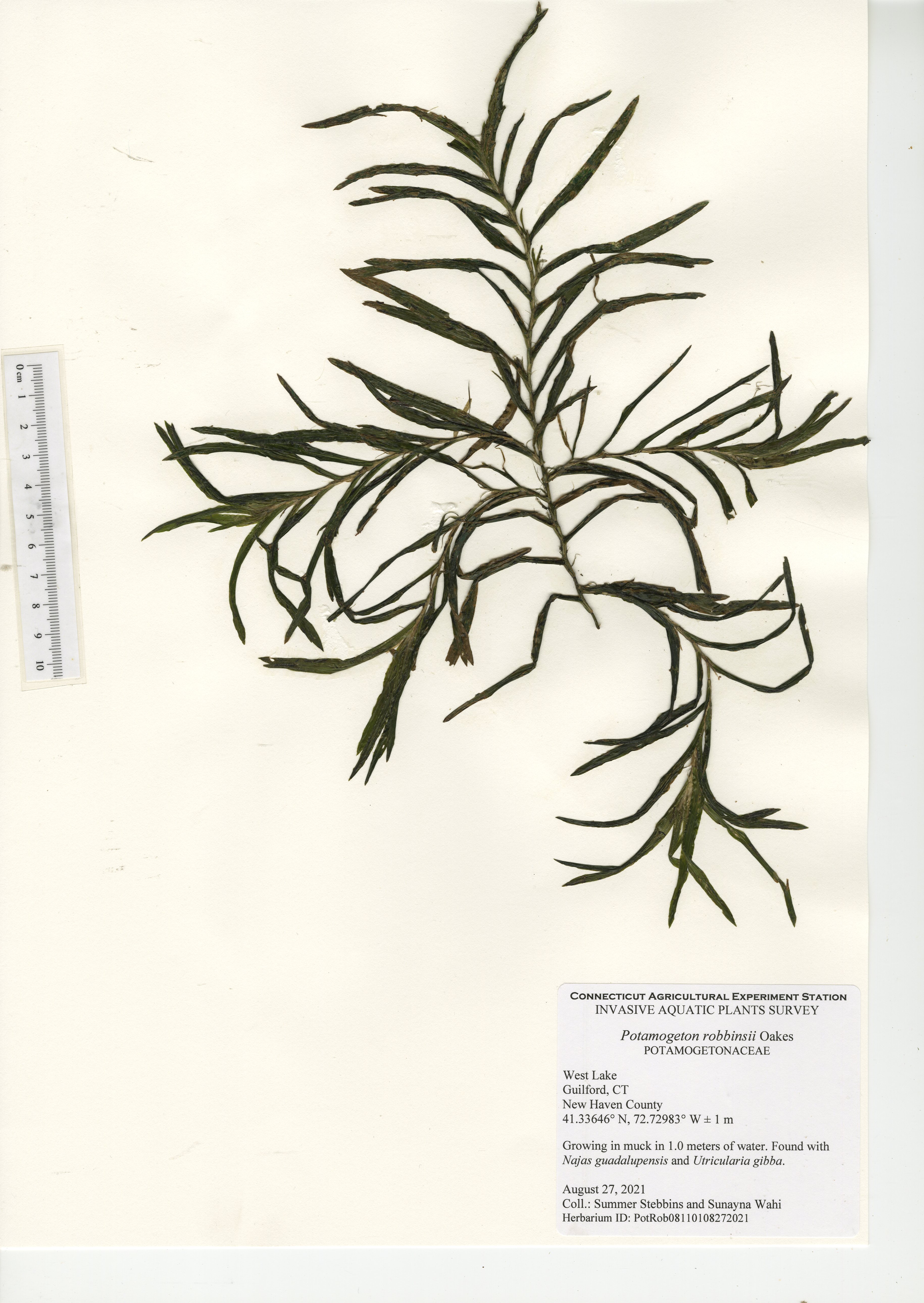 West Lake is a 52-acre lake located in Guilford, CT. The lake was surveyed for the third time in 2021 by CAES IAPP with the previous surveys occurring in 2005 and 2010. Nineteen native species were found in 2021, compared to 27 in 2010 and 18 in 2005. Minor naiad (Najas minor) was the only non-native invasive aquatic plant found during the 2005 and 2010 surveys; however, it was not observed during our 2021 survey. No invasive aquatic plants were therefore observed in 2021. This along with the decline in native species was likely caused by an aquatic herbicide application performed approximately a month prior to our survey. Two invasive non-aquatic wetland plants were found during the 2021 survey: phragmites (Phragmites australis) and purple loosestrife (Lythrum salicaria). Our documentation of non-aquatic plant species is outside the scope of CAES IAPP surveys and is performed at the discretion of the surveyor. Comparing their presence from survey-to-survey is therefore unreliable.