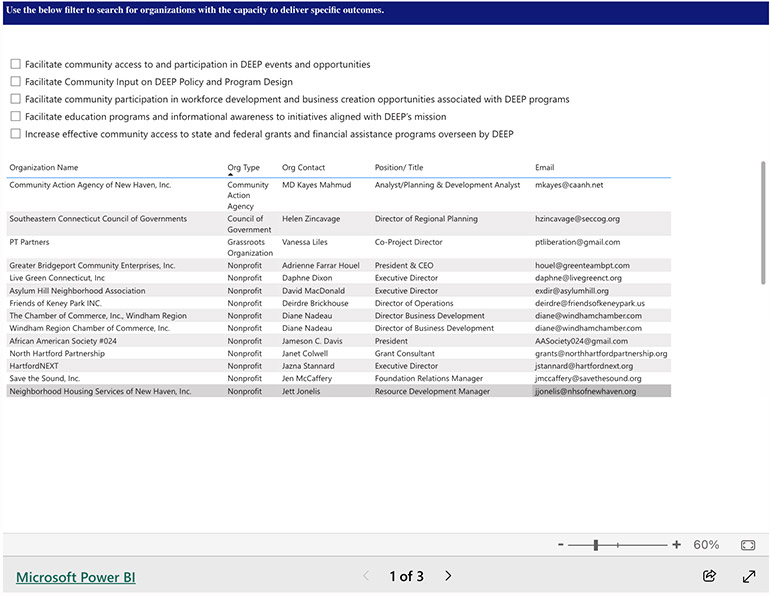 In February 2025, DEEP hosted an informational session and a Meet and Greet over Zoom. About 50 participants from across Connecticut’s 8 counties joined the meeting to learn more about the RFQ and how their proposals will be evaluated. The Meet and Greets were a great success in facilitating discussions between eligible entities and sparking collaboration on Hub applications! DEEP also created a Community Hub Clearinghouse, a database for interested applicants to the Community Resource Hubs RFQ. Staff were able to use the information from the database to facilitate potential partnerships between organizations and to connect with organizations who provide technical support.