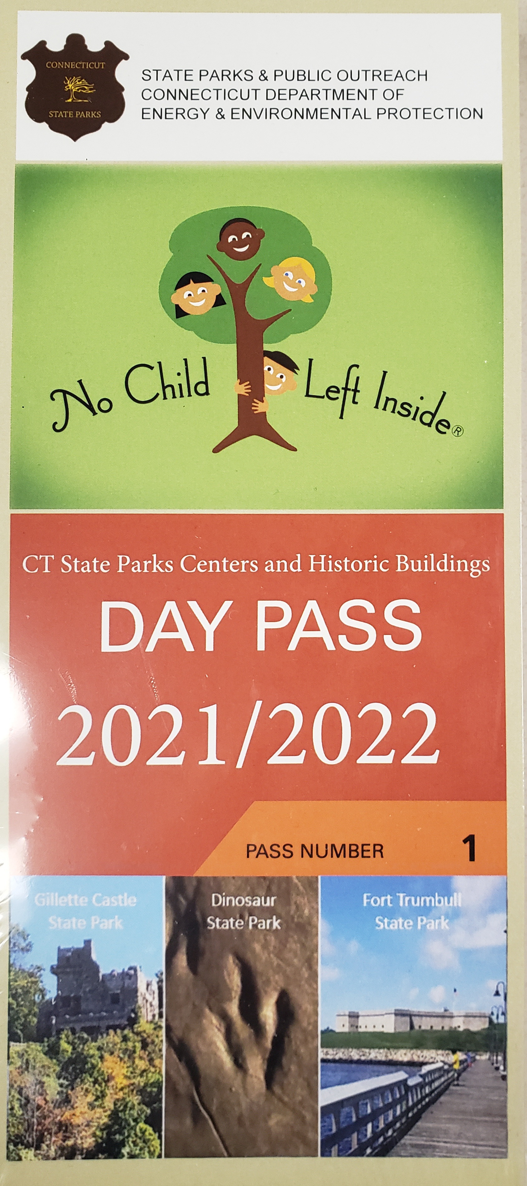 The Connecticut Department of Energy and Environmental Protection has again partnered with the Connecticut Library Consortium to provide CT State Parks' Centers and Historic Buildings Day Passes at the main library branch for each Connecticut town. Connecticut residents in a Connecticut registered vehicle are no longer required to pay a parking fee at state parks and forests.