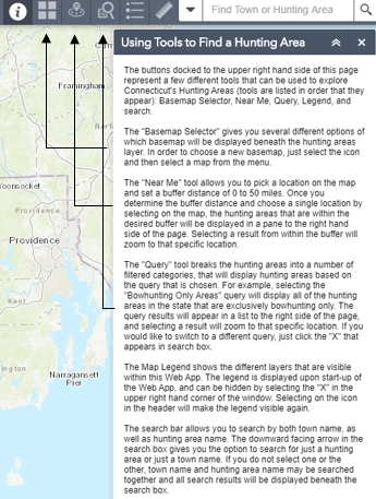 The Connecticut Hunting Area interactive map tool gives the hunter a powerful suite of utilities to help plan a hunt. To launch the app inside a web browser, use the link at the top of this page, or select here (to use alongside this guide, it is recommended to right-click and choose "Open in new window" to work alongside or split screen).