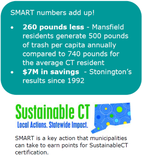 SMART is a key cost savings strategy for municipalities to meet CT's 60% diversion goal by 2024. The State of Connecticut has long identified SMART as a key strategy for reducing waste, most recently in the State's Comprehensive Materials Management Strategy (2016) and previously in the Modernizing Recycling Working Group Recommendations (2012) and the State's Solid Waste Management Plan (original dated 1991, amended in 2006).