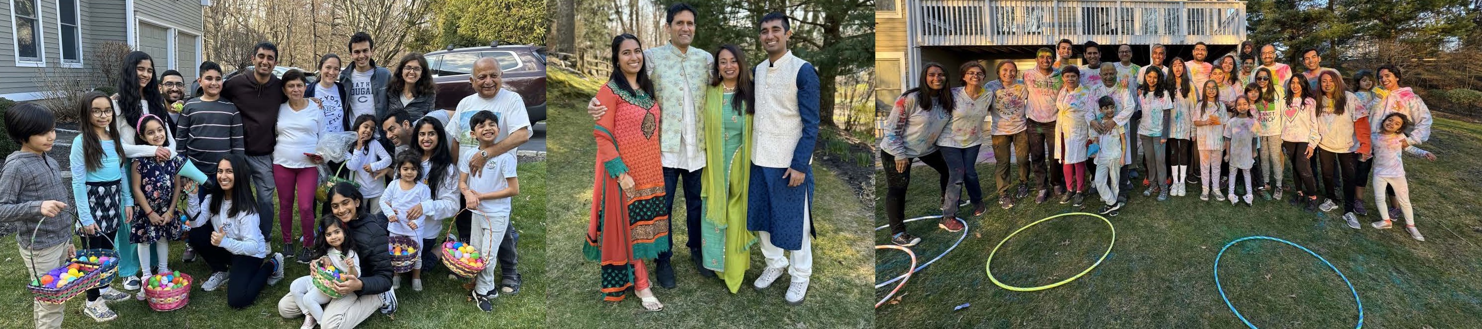 I’ve included three photos of my family gathering last weekend for an event we call Holi Easter. We start off with a traditional Easter Egg Hunt, then we celebrate the colors of Holi, which includes throwing a rainbow of colored powder at each other. Many colors have different meanings; red, for example, symbolizes love and fertility while green stands for new beginnings.